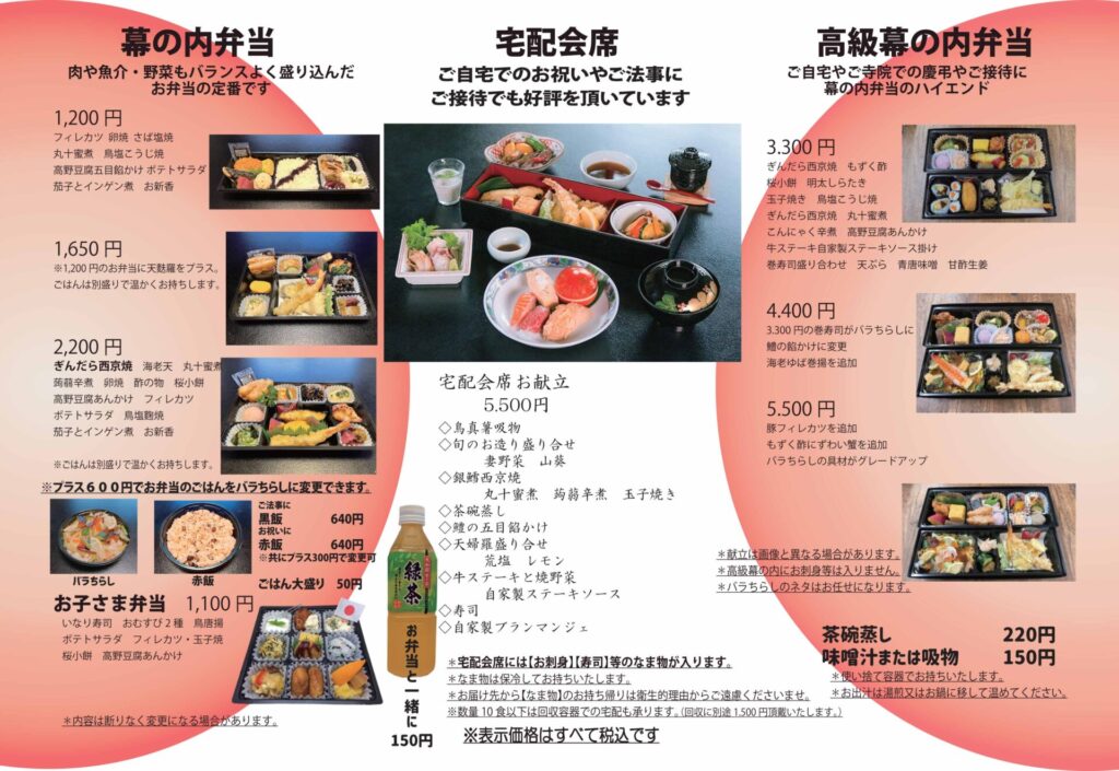 法人様の会議用・ご法事・各種会合にご利用いただいております。※宅配会席のようにお刺身や生寿司は入りません。